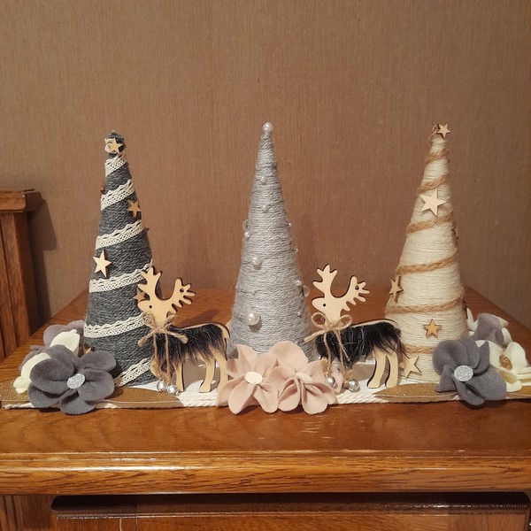 Deux rennes qui n auront pas froids au pied de sapins en formede cônes décorés de fleurs en feutrine pour finaliser la deco
